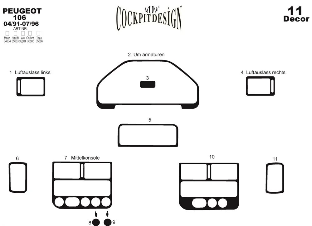 Накладки на панель (1991-1996) Дерево Peugeot Peugeot 106Trend Tuning – це ваш надійний партнер у світі автотюнінгу та аксесуарів! Ми пропонуємо широкий асортимент високоякісних товарів для тих, хто прагне зробити свій автомобіль унікальним, стильним і функціональним. У нашому магазині ви знайдете все необхідне: від аеродинамічних обвісів, спортивних вихлопних систем і колісних дисків до внутрішніх аксесуарів, LED-освітлення та електроніки для підвищення комфорту та продуктивності.