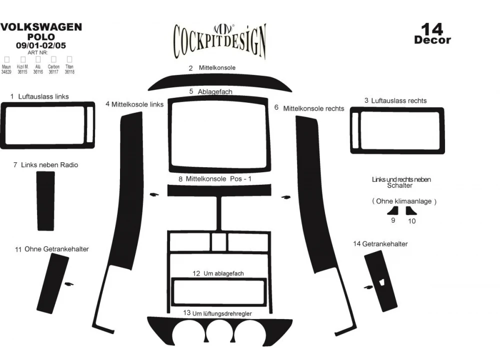 Накладки на панель (2001-2005) Титан Volkswagen Volkswagen Polo 2001-2009 рр.Trend Tuning – це ваш надійний партнер у світі автотюнінгу та аксесуарів! Ми пропонуємо широкий асортимент високоякісних товарів для тих, хто прагне зробити свій автомобіль унікальним, стильним і функціональним. У нашому магазині ви знайдете все необхідне: від аеродинамічних обвісів, спортивних вихлопних систем і колісних дисків до внутрішніх аксесуарів, LED-освітлення та електроніки для підвищення комфорту та продуктивності.