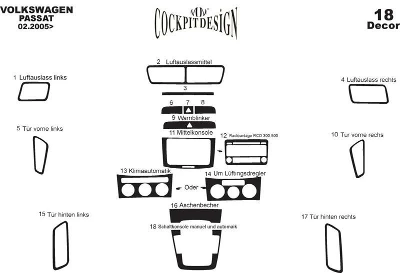 Накладки на панель Дерево Volkswagen Volkswagen Passat B6 2006-2012рр.Trend Tuning – це ваш надійний партнер у світі автотюнінгу та аксесуарів! Ми пропонуємо широкий асортимент високоякісних товарів для тих, хто прагне зробити свій автомобіль унікальним, стильним і функціональним. У нашому магазині ви знайдете все необхідне: від аеродинамічних обвісів, спортивних вихлопних систем і колісних дисків до внутрішніх аксесуарів, LED-освітлення та електроніки для підвищення комфорту та продуктивності.