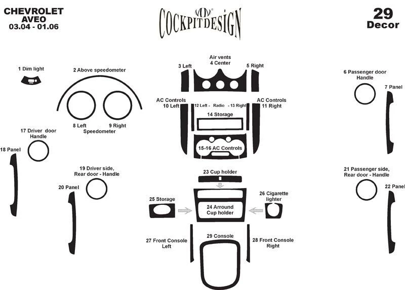 Накладки в салон Темне дерево Chevrolet Chevrolet Aveo T200 2002-2008 рр.Trend Tuning – це ваш надійний партнер у світі автотюнінгу та аксесуарів! Ми пропонуємо широкий асортимент високоякісних товарів для тих, хто прагне зробити свій автомобіль унікальним, стильним і функціональним. У нашому магазині ви знайдете все необхідне: від аеродинамічних обвісів, спортивних вихлопних систем і колісних дисків до внутрішніх аксесуарів, LED-освітлення та електроніки для підвищення комфорту та продуктивності.